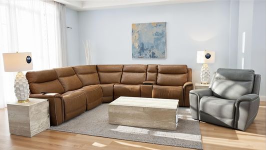 Sink into this super sleek power reclining modular sectional with power headrest, massage and zero gravity for the ultimate comfort. Upholstered in a beautiful color of butternut leather, this sectional also features wireless charging in its console with cupholders.Read More
