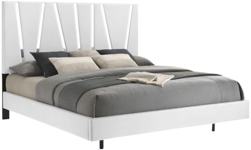 The sophisticated look is achieved by the combination of the majestic headboard, glossy white finish, acrylic drawer pulls and modern mylar accents.